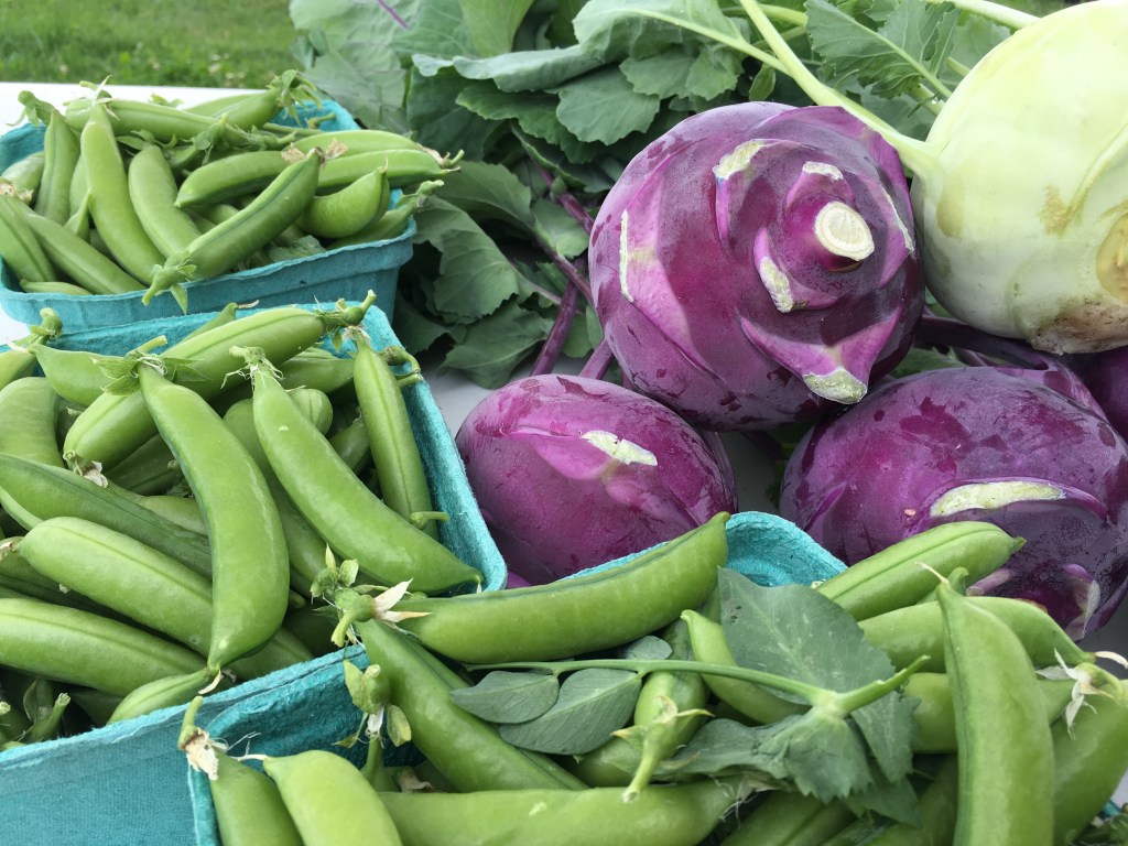 April/May, June, July: Salad mix, spinach, pea shoots, scallions, sugar snap peas, snow peas, salad turnips, radishes, parsley, cilantro, head lettuces, kale, chard, green beans, fresh garlic, thyme, basil, summer squash, baby bok choi, carrots, beets, cabbage, cauliflower, cherry tomatoes, frying peppers, cucumbers, kohlrabi, broccolini (and flowers too!)