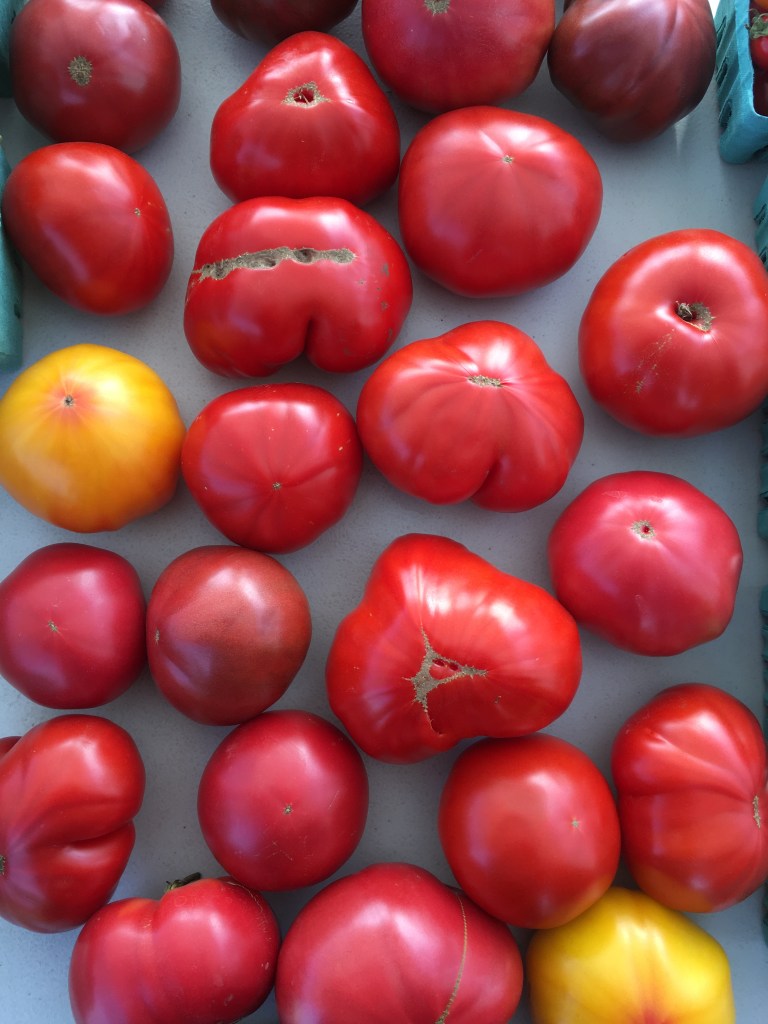 August and September: All the veggies from June and July, plus now sweet and spicy peppers, sweet corn, lots of wonderful tomatoes, eggplant, tomatillos, artichokes